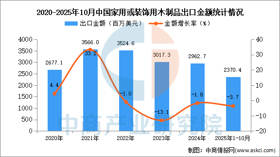 从金额方面来看,数据显示,2025年1-10月中国家用或装饰用木制品出口金额2370.4百万美元,同比下降3.7%。