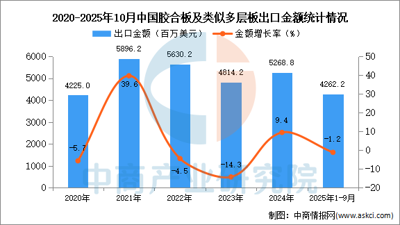 2025年10月中国胶合板及类似多层板出口量及金额增长情况