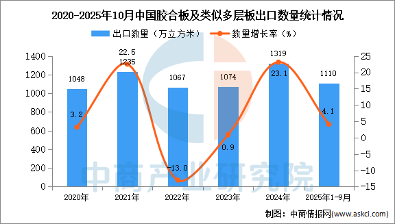 中商情报网讯:据中商产业研究院数据库显示,2024年我国胶合板及类似多层板出口量1319万立方米,同比增长23.1%。最新数据显示,2025年1-10月中国胶合板及类似多层板出口量1110万立方米,同比增长4.1%。