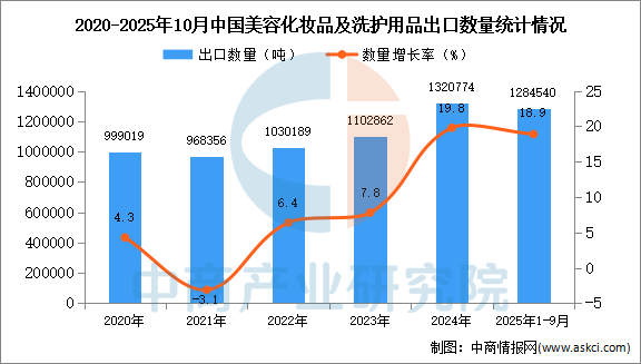 2025年10月中国美容化妆品及洗护用品出口量及金额增长情况