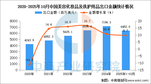 从金额方面来看,数据显示,2025年1-10月中国美容化妆品及洗护用品出口金额6452百万美元,同比增长9.7%。