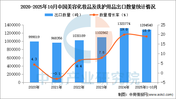 中商情报网讯:据中商产业研究院数据库显示,2024年我国美容化妆品及洗护用品出口量1320774吨,同比增长19.8%。最新数据显示,2025年1-10月中国美容化妆品及洗护用品出口量1284540吨,同比增长18.9%。