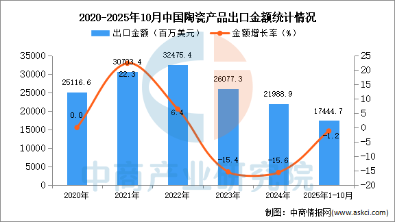 2025年10月中国陶瓷产品出口量及金额增长情况