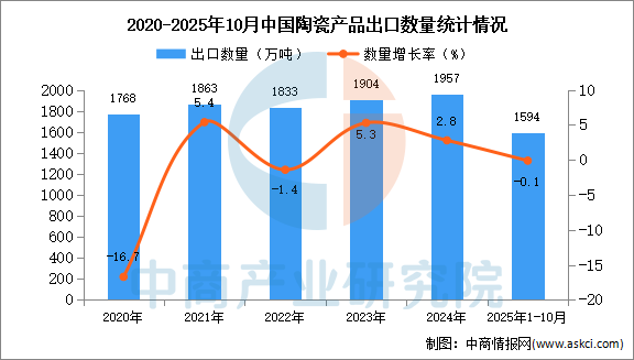 中商情报网讯:据中商产业研究院数据库显示,2024年我国陶瓷产品出口量1957万吨,同比增长2.8%。最新数据显示,2025年1-10月中国陶瓷产品出口量1594万吨,同比下降0.1%。