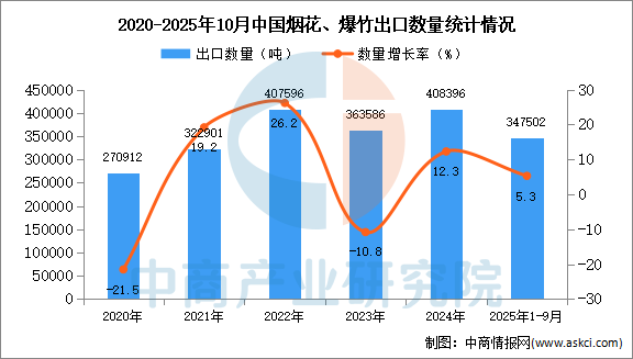 2025年10月中国烟花、爆竹出口量及金额增长情况