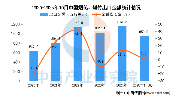从金额方面来看,数据显示,2025年1-10月中国烟花、爆竹出口金额952百万美元,同比增长1%。