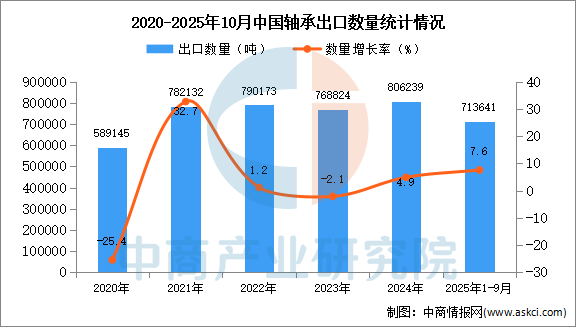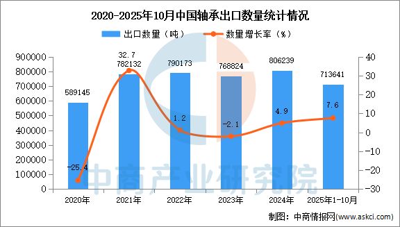 中商情报网讯:据中商产业研究院数据库显示,2024年中国轴承出口量806239吨,同比增长4.9%。最新数据显示,2025年1-10月中国轴承出口量713641吨,同比增长7.6%。