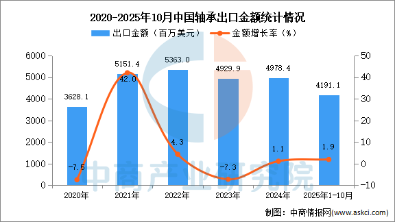 从金额方面来看,数据显示,2025年1-10月中国轴承出口金额4191.1百万美元,同比增长1.9%。