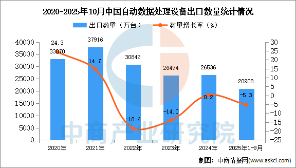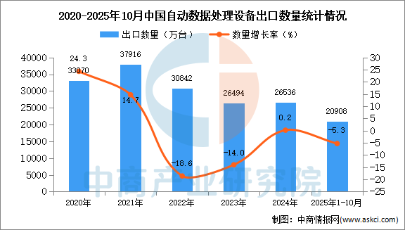 中商情报网讯:据中商产业研究院数据库显示,2024年中国自动数据处理设备出口量26536万台,同比增长0.2%。最新数据显示,2025年1-10月中国自动数据处理设备出口量20908万台,同比下降5.3%。