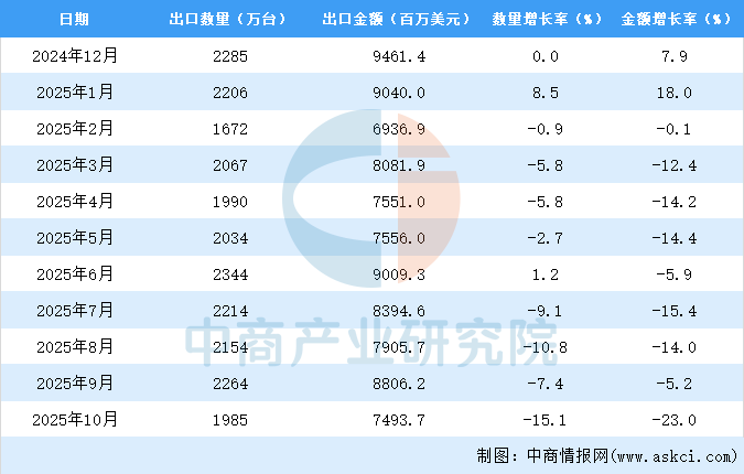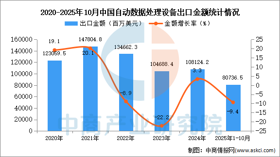 从金额方面来看,数据显示,2025年1-10月中国自动数据处理设备出口金额80736.5百万美元,同比下降9.4%。