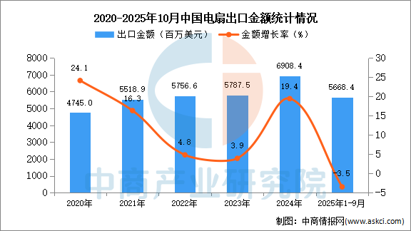 从金额方面来看,数据显示,2025年1-10月中国电扇出口金额5668.4百万美元,同比下降3.5%。