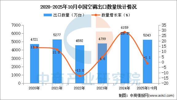 中商情报网讯:据中商产业研究院数据库显示,2024年中国空调出口量6159万台,同比增长28.3%。最新数据显示,2025年1-10月中国空调出口量5243万台,同比下降1.1%。