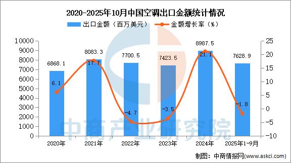 从金额方面来看,数据显示,2025年1-10月中国空调出口金额7628.9百万美元,同比下降1.8%。