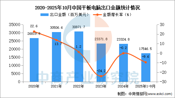 从金额方面来看,数据显示,2025年1-10月中国平板电脑出口金额17546.5百万美元,同比下降9.6%。