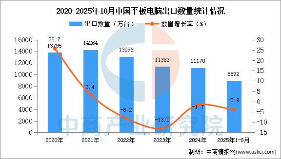 中商情报网讯:据中商产业研究院数据库显示,2024年中国平板电脑出口量11170万台,同比下降1.7%。最新数据显示,2025年1-10月中国平板电脑出口量8892万台,同比下降3.9%。