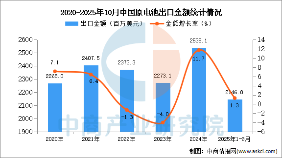 从金额方面来看,数据显示,2025年1-10月中国原电池出口金额2146.8百万美元,同比增长1.3%。