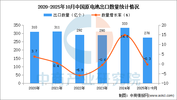 中商情报网讯:据中商产业研究院数据库显示,2024年中国原电池出口量333亿个,同比增长14.8%。最新数据显示,2025年1-10月中国原电池出口量276亿个,同比下降0.3%。
