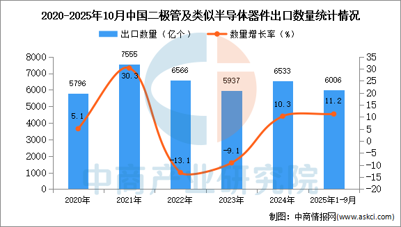 中商情报网讯:据中商产业研究院数据库显示,2024年中国二极管及类似半导体器件出口量6533亿个,同比增长10.3%。最新数据显示,2025年1-10月中国二极管及类似半导体器件出口量6006亿个,同比增长11.2%。