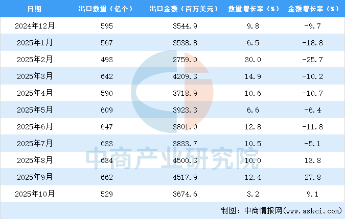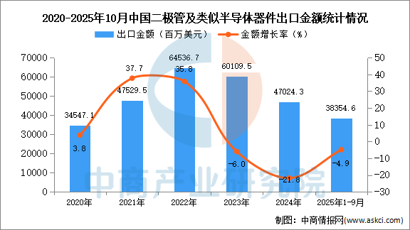 2025年10月中国二极管及类似半导体器件出口量及金额增长情况