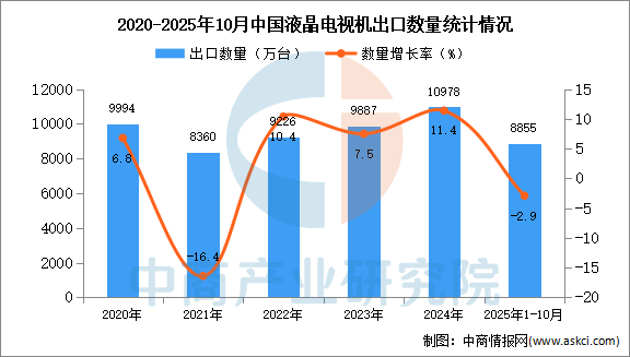中商情报网讯:据中商产业研究院数据库显示,2024年中国液晶电视机出口量10978万台,同比增长11.4%。最新数据显示,2025年1-10月中国液晶电视机出口量8855万台,同比下降2.9%。