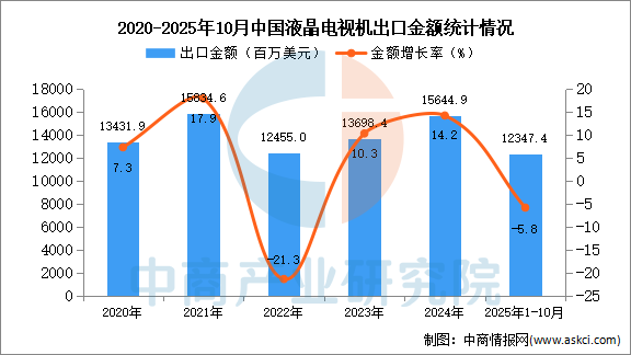 从金额方面来看,数据显示,2025年1-10月中国液晶电视机出口金额12347.4百万美元,同比下降5.8%。