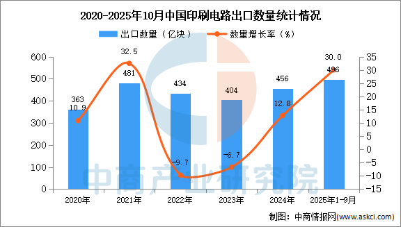 中商情报网讯:据中商产业研究院数据库显示,2024年中国印刷电路出口量456亿块,同比增长12.8%。最新数据显示,2025年1-10月中国印刷电路出口量496亿块,同比增长30%。