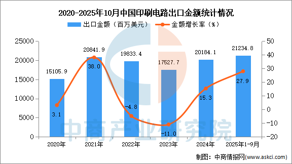从金额方面来看,数据显示,2025年1-10月中国印刷电路出口金额21234.8百万美元,同比增长27.9%。
