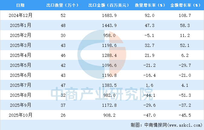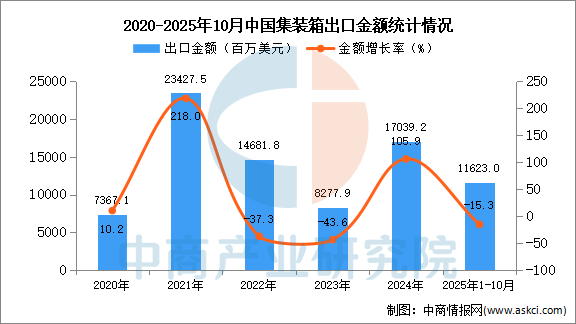 从金额方面来看,数据显示,2025年1-10月中国集装箱出口金额11623百万美元,同比下降15.3%。