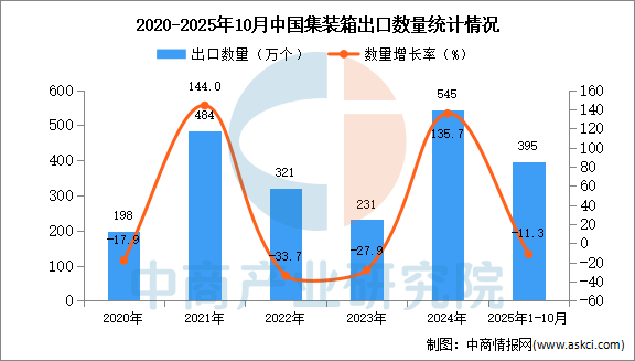 中商情报网讯:据中商产业研究院数据库显示,2024年中国集装箱出口量309万个,同比增长61.8%。最新数据显示,2025年1-10月中国集装箱出口量395万个,同比下降11.3%。