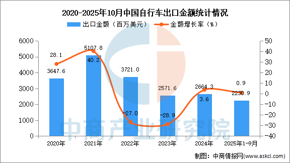 从金额方面来看,数据显示,2025年1-10月中国自行车出口金额2230.9百万美元,同比增长0.9%。