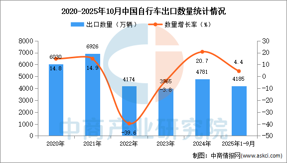 中商情报网讯:据中商产业研究院数据库显示,2024年中国自行车出口量4781万辆,同比增长20.7%。最新数据显示,2025年1-10月中国自行车出口量4185万辆,同比增长4.4%。