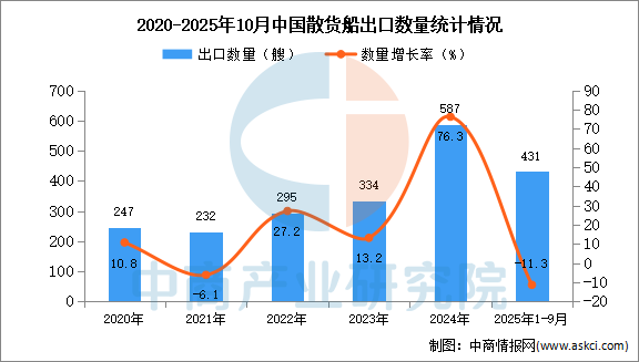 中商情报网讯:据中商产业研究院数据库显示,2024年中国散货船出口量587艘,同比增长76.3%。最新数据显示,2025年1-10月中国散货船出口量431艘,同比下降11.3%。