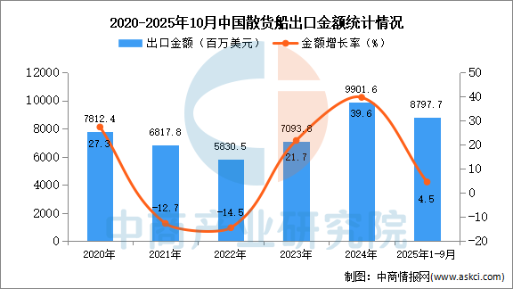 从金额方面来看,数据显示,2025年1-10月中国散货船出口金额8797.7百万美元,同比增长4.5%