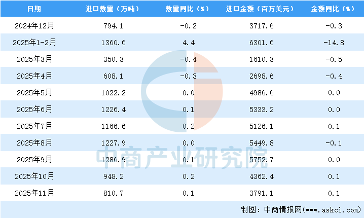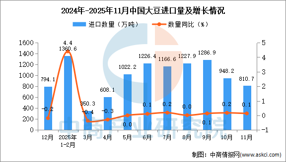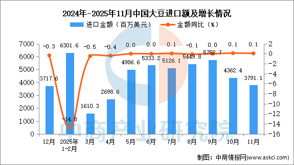 2025年11月中国大豆进口量及金额增长情况