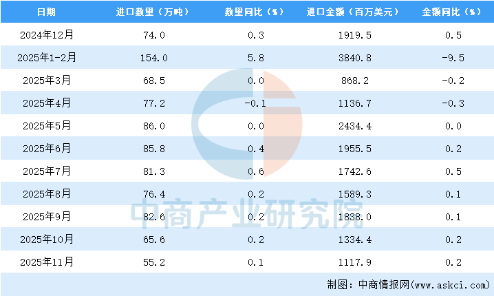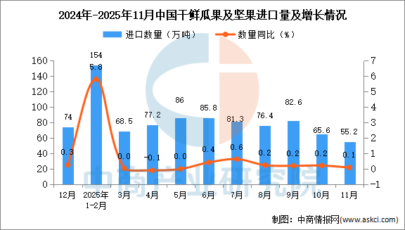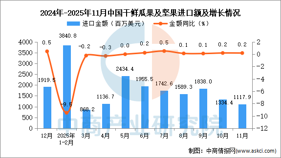 2025年11月中国干鲜瓜果及坚果进口量及金额增长情况