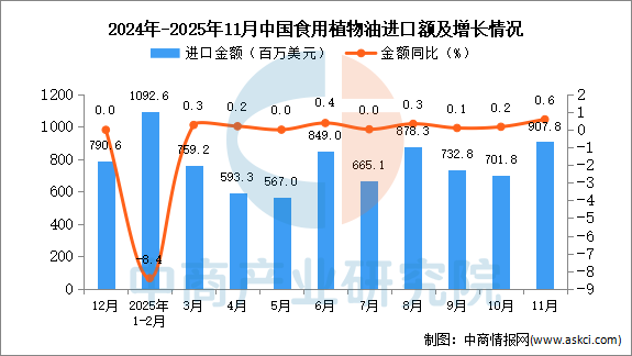 从金额方面来看,2025年11月中国食用植物油进口金额907.8百万美元,同比增长0.6%;1-11月我国食用植物油累计进口金额7777.7百万美元,同比增长17.4%。
