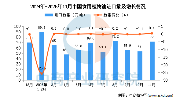 中商情报网讯:据中商产业研究院数据库显示,2025年11月中国食用植物油进口量72万吨,同比增长0.4%;1-11月我国食用植物油累计进口量627万吨,同比下降3%。