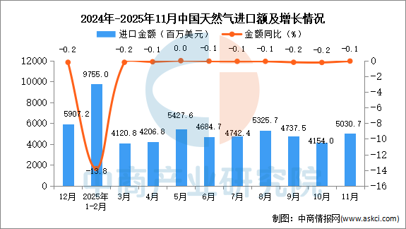从金额方面来看,2025年11月中国天然气进口金额5030.7百万美元,同比下降0.1%;1-11月中国天然气进口金额50874.3百万美元,同比下降14.3%。