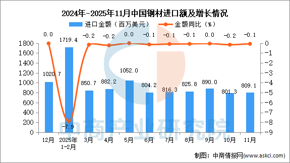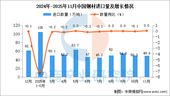 中商情报网讯:据中商产业研究院数据库显示,2025年11月中国钢材进口量49.6万吨,同比增长持平;1-11月中国钢材进口量554.1万吨,同比下降10.5%。
