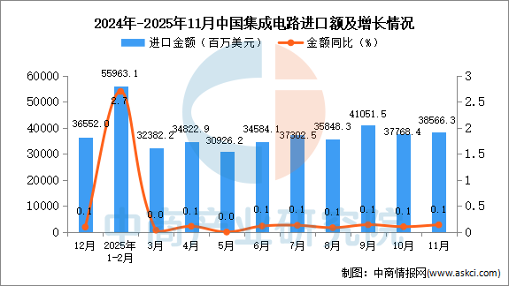 2025年11月中国集成电路进口量及金额增长情况