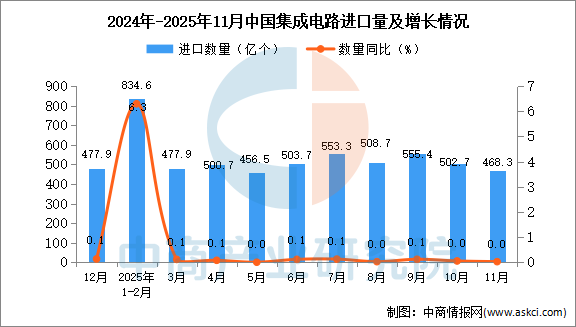 中商情报网讯:据中商产业研究院数据库显示,2025年11月中国集成电路进口量468.3亿个,同比增长持平;1-11月中国集成电路进口量5406.8亿个,同比增长7.9%。