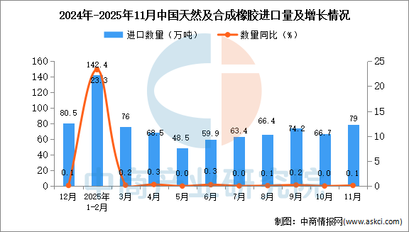 中商情报网讯:据中商产业研究院数据库显示,2025年11月中国天然及合成橡胶(包括胶乳)进口量79万吨,同比增长0.1%;1-11月我国天然及合成橡胶(包括胶乳)累计进口量757.2万吨,同比增长16.5%。