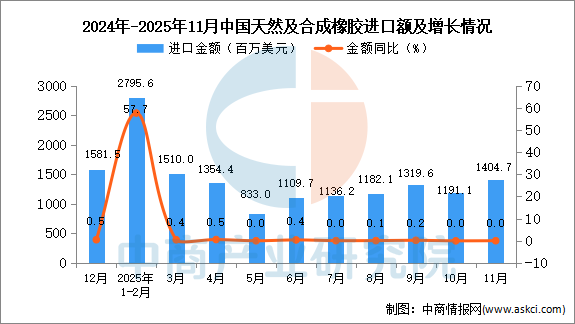 2025年11月中国天然及合成橡胶(包括胶乳)进口量及金额增长情况