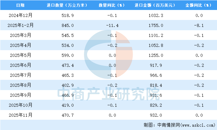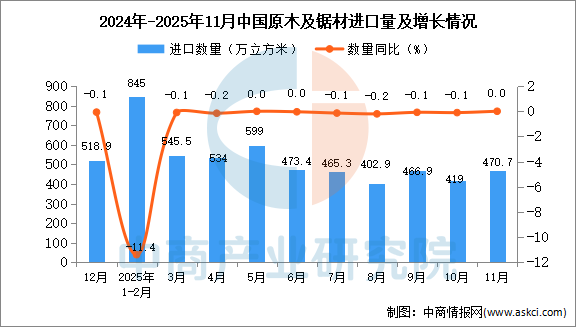 中商情报网讯:据中商产业研究院数据库显示,2025年11月中国原木及锯材进口量470.7万立方米,同比增长持平;1-11月中国原木及锯材进口量5107.3万立方米,同比下降11.4%。