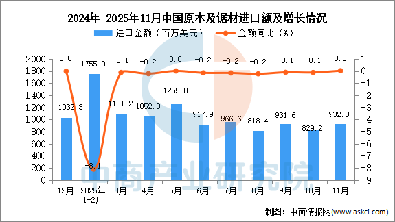 从金额方面来看,2025年11月中国原木及锯材进口金额932百万美元,同比增长持平;1-11月中国原木及锯材进口金额10291.8百万美元,同比下降14.2%。