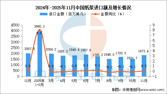 从金额方面来看,2025年11月中国纸浆进口金额1873.4百万美元,同比增长持平;1-11月中国纸浆进口金额20069.2百万美元,同比下降1.6%。