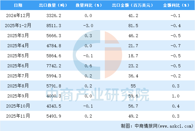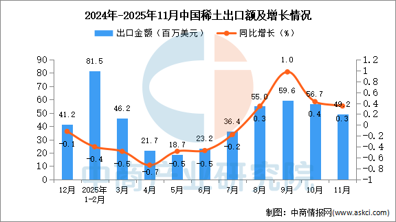 从金额方面来看,2025年11月中国稀土出口金额49.2百万美元,同比增长0.3%;1-11月中国稀土出口金额448.3百万美元,同比下降0.1%。