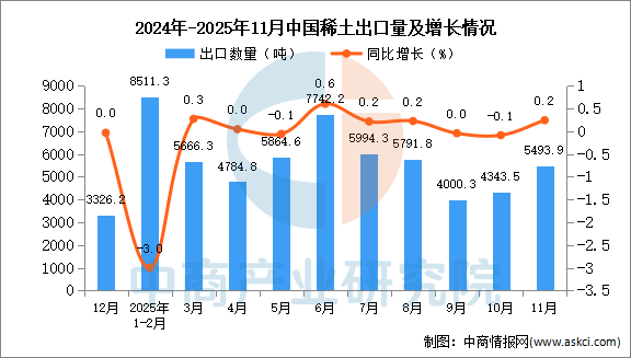 中商情报网讯:据中商产业研究院数据库显示,2025年11月中国稀土出口量5493.9吨,同比增长0.2%;1-11月中国稀土出口量58193.1吨,同比增长11.7%。