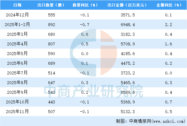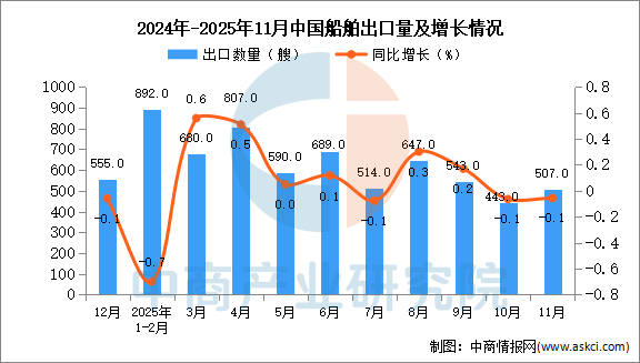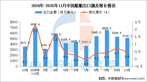 2025年11月中国船舶出口量及金额增长情况