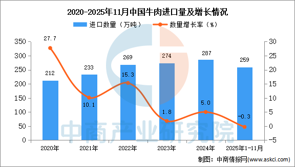 2025年11月中国牛肉进口量及金额增长情况